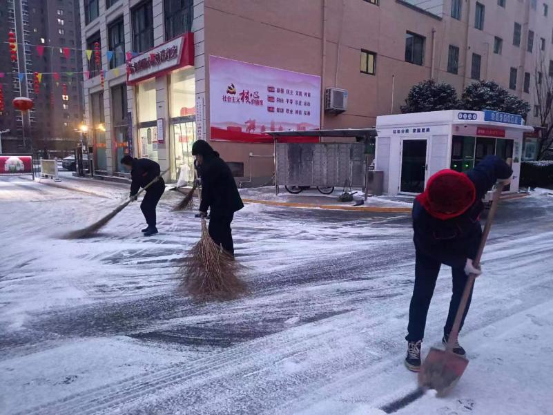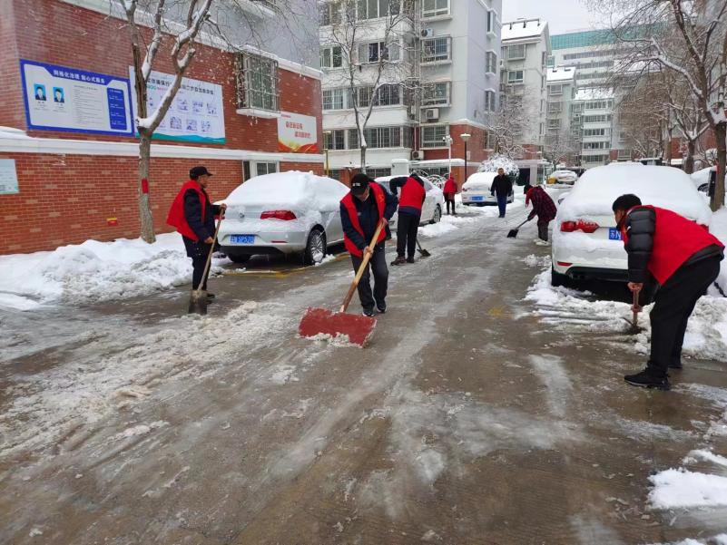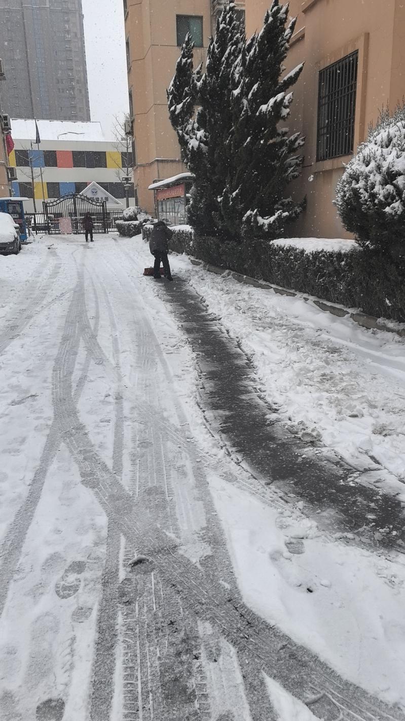 在雪中,公司党支部迅速组织党员同志率先到小区参与铲雪。由于积雪很厚,铲雪工作异常艰巨,但他们没有退缩,而是迎难而上。为了保证业主的出行,我司全体员工出动,清理小区主干道,在每个单元门门口都铲出一条小路,然后撒融雪剂和盐,预防结冰,保证业主安全通行。